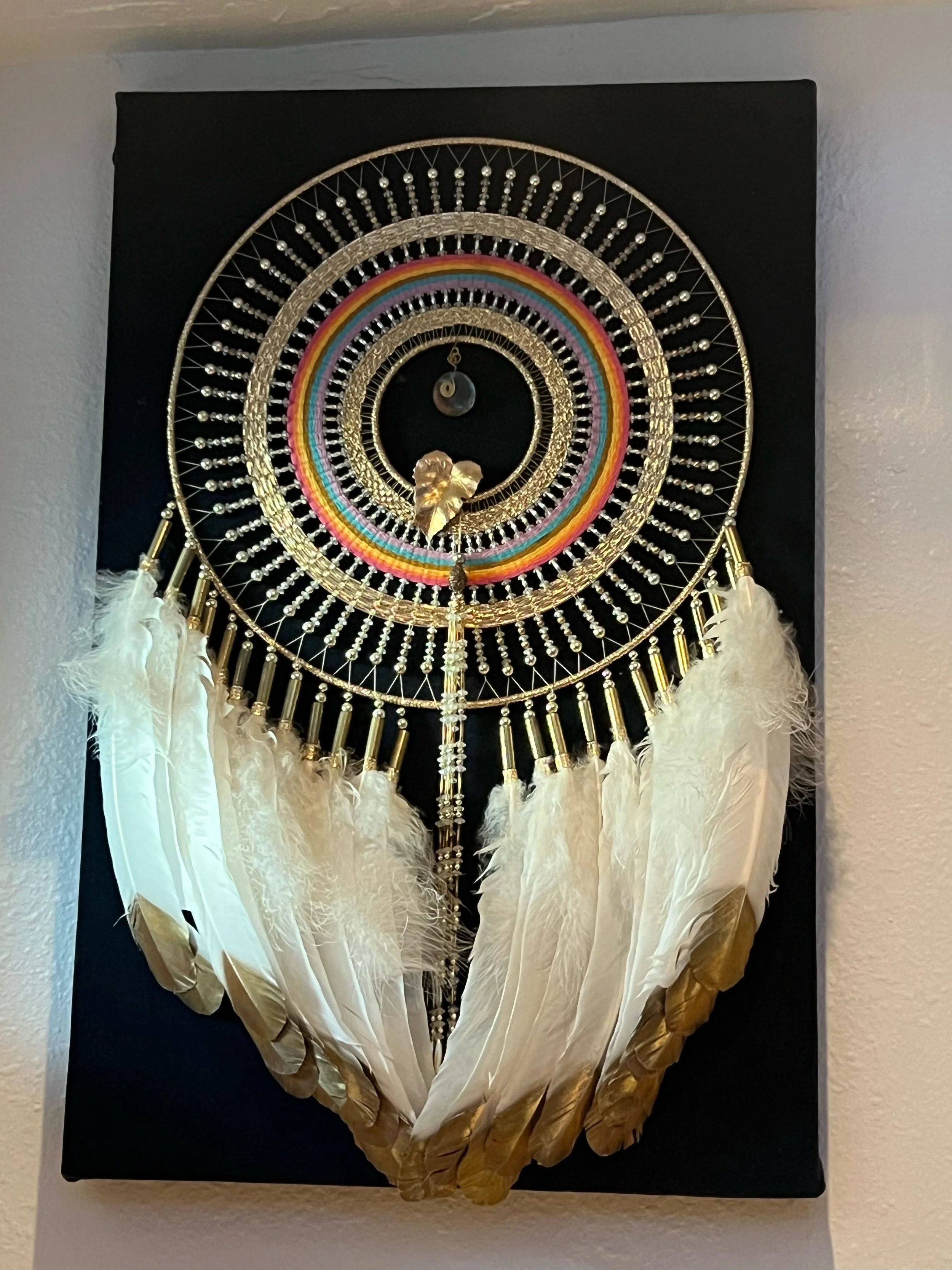 The gorgeous mandala is an energy vortex and a meditation centerpiece. White with golden-tipped feathers represents the wind beneath our wings, and life feels a whole heck of a lot lighter all of a sudden. Deep breaths begin to happen naturally and exhales come out with a sigh. It’s real healing happening with all the elements in that special room some of you have frequented!!